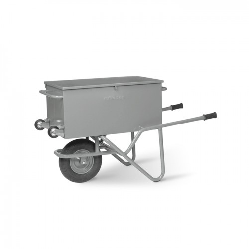 Équipée d’une boîte détachable et/ou empilable quand elle n’est pas sur le châssis de la brouette. Adaptée pour être montée facilement dans un véhicule (camionnette) par une seule personne grâce à ses deux roulettes.