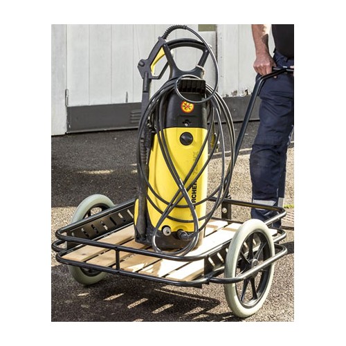 Chariot de manutention en acier thermolaqué avec plateau en bois de dimensions intérieures 820 x 650 x 100 mm équipé de roues anti-crevaison de 400 mm de diamètre. Chariot design permettant le transport d'outils de jardin par exemple.