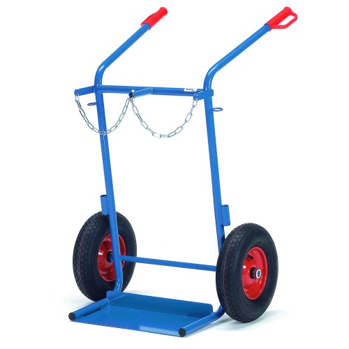 Diable mécano-soudé avec revêtement époxy bleu RAL 5007, support de bouteilles avec chaînes d'attache, roues à bandage caoutchouc ou gonflables. Cet équipement est pratique pour 2 bouteilles de 40-50 litres, de 204-229 mm de diamètre.
