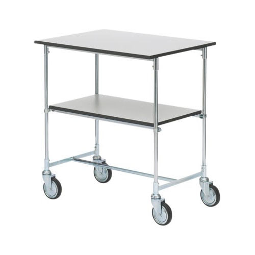 Tables mobiles avec deux plateaux laminés ESD (la tablette inférieure est réglable sur toute la hauteur). Le châssis est en tubes brillants galvanisés de 22 mm. La charge maximale est de 100 kg. Cet équipement est muni de 4 roulettes pivotantes avec bande grise en caoutchouc 125x32 mm (moyeu de roulement à billes et protection filaire conçus pour ESD).