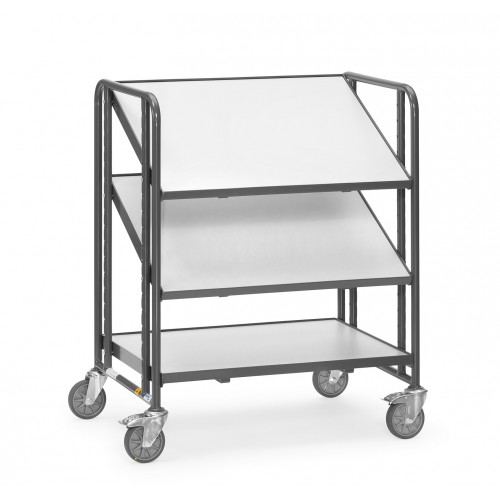 Chariot porte-bacs de construction mécano-soudé en tube d'acier avec 3 étagères inclinées en bois.