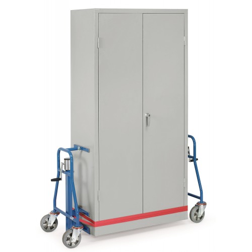 Diable élévateur jumelé pour le déplacement de meubles encombrants, par une seule personne. Il est recouvert d'une résine époxy bleu RAL 5007. Il s'agit d'un treuil possédant une vis sans fin protégé par un U en acier. Les supports de meubles sont couverts de feutres. Il est dôté de 2 roues pivotantes non traçantes. La hauteur en position basse est de 10 mm. Vendu avec 1 sangle d'arrimage. Livré par paire.